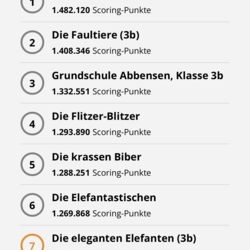 Und unsere Kids sind ganz vorne mit dabei, wenn die Laufpandas, die eleganten Elefanten, die flotten Füchse oder die Blitzschildkröten um die Scoring-Punkte kämpfen. Zwischenzeitlich tummelten sich unsere Elefanten sogar auf dem 7. Platz! Klasse!