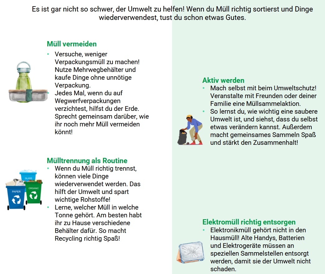 Vom 02. - 09.12. steht die erste von drei Bewegungs-Challenges an: Müll sammeln und so die Umwelt schützen. Denn der Grundsatz "Gesundheit" wird ganzheitlich behandelt. Viele Aspekte einer gesunden & aktiven Lebensweise sollen in den Alltag der Kinder integriert werden.