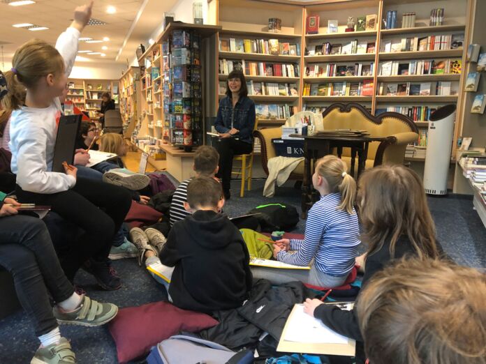 Zu dem rundum gelungen Besuch gehörte eine Fragerunde mit einer Buchhändlerin rund um die vielfältigen Aufgaben des Berufs, ein kleines Quiz für clevere Rätselfreunde und eine kreative „Cover-Challenge“, bei der die Kinder das Titelbild neuer Kinderbücher erraten und zu Papier bringen konnten.